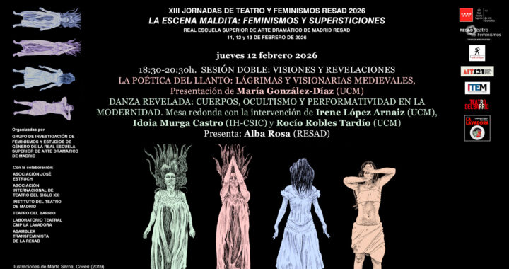 Anunciamos las XIII Jornadas de Teatro y Feminismos RESAD 2026 organizadas por el Grupo de Investigación de Feminismos y Estudios de Género de la Real Escuela Superior de Arte Dramático de Madrid. Con la colaboración de la Asociación José Estruch, Instituto del Teatro de Madrid, Teatro del Barrio, Laboratorio Teatral CMP La Lavadora, Asociación Internacional de Teatro del Siglo XXI y la Asamblea Transfeminista de la RESAD. Participan Ana Contreras (organización) y María González con una comunicación titulada "La poética del llanto: lágrimas y visionarias medievales".