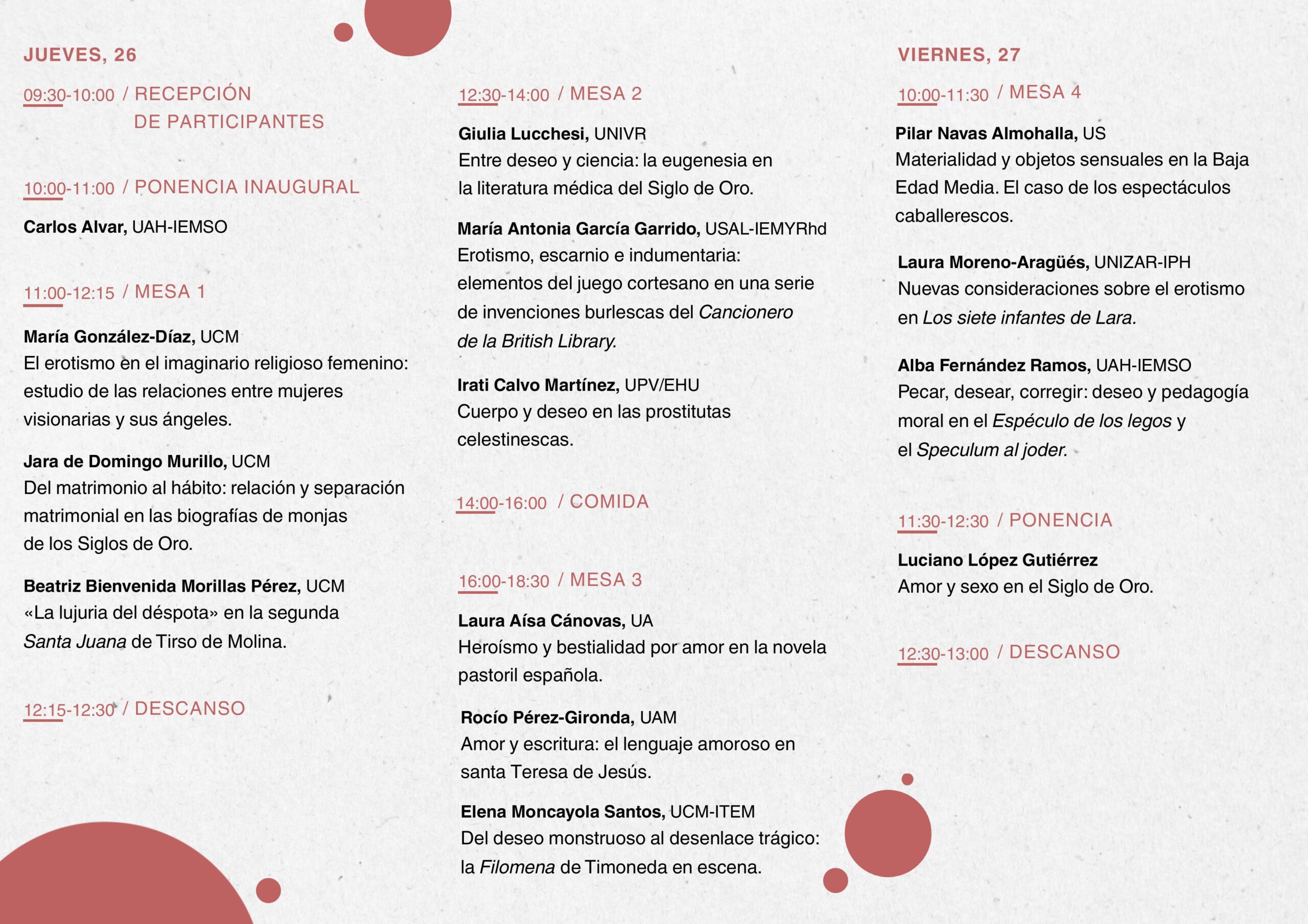 Seminario «En los márgenes del deseo: formas ilícitas de amor en los siglos XIV y XVII» Publicado el 12 de febrero de 202612 de febrero de 2026 por admin Inicio / Noticias / Noticias / Seminario / Seminario «En los márgenes del deseo: formas ilícitas de amor en los siglos XIV y XVII» 26 y 27 de febrero de 2026 Universidad Complutense de Madrid Anunciamos el seminario "En los márgenes del deseo: formas ilícitas de amor en los siglos XIV y XVII". Participan María González, Jara Murillo y Beatriz Bienvenida Morillas en la mesa 1. Compártelo: Compartir en X (Se abre en una ventana nueva) X Comparte en Facebook (Se abre en una ventana nueva) Facebook Publicado en Noticias, Seminario.